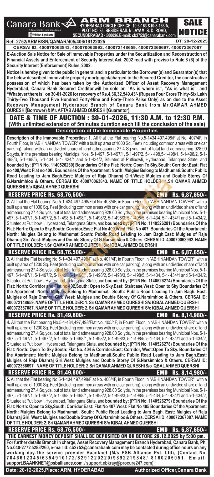 5. All that the Flat bearing No.5-1-434,497,498/Flat No. 406/4F, in Fourth Floor, in "ABHINANDAN TOWER", with a built up area of 1000 Sq. Feet (including common areas with one car parking), along with an undivided share of land admeasuring 27.4 Sq.yds, out of total land admeasuring 928.00 Sq.yds, in the premises bearing Municipal Nos. 5-1-497, 5-1-497/1, 5-1-497/2, 5-1-498,5-1-498/1, 5-1-498/2, 5-1-498/3, 5-1-498/5, 5-1-434, 5-1-434/1 and 5-1-434/2, Situated at Putlibowli, Hyderabad, Telangana State, and bounded by: (PTIN No. 1140526279) Boundaries Of the Flat: North: Open to Sky, South: Corridor, East: Flat No 407, West: Flat No 405 Boundaries Of the Apartment: North: Mulgies Belong to Madhumati. South: Public Road Leading to Jam Bagh. East: Mulgies of Raja Dhanraj Giri. West: Mulgies and Double Storey Of G.Narsimhloo & Others. CERSAI ID: 400072367087. NAME OF TITLE HOLDER: 2. Sri QAMAR AHMED QURESHI S/O IQBAL AHMED QUERSHI