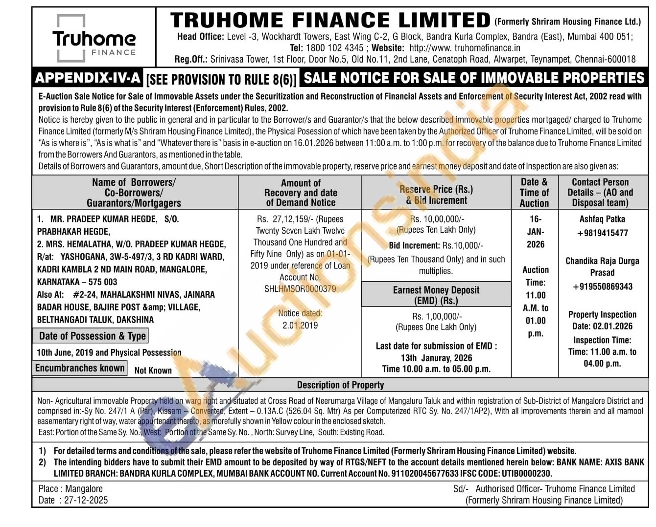 Non- Agricultural immovable Property held on warg right and situated at Cross Road of Neerumarga Village of Mangaluru Taluk and within registration of Sub-District of Mangalore District and comprised in:-Sy No. 247/1 A (Par), Kissam Converted, Extent 0.13A.C (526.04 Sq. Mtr) As per Computerized RTC Sy. No. 247/1AP2), With all improvements therein and all mamool easementary right of way, water appurtenant thereto, as morefully shown in Yellow colour in the enclosed sketch. East: Portion of the Same Sy. No., West: Portion of the Same Sy. No., North: Survey Line, South: Existing Road