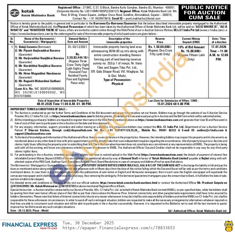 Immovable property having land area admeasuring 8094.00 sq mts along with entire construction standing thereon forming part of land bearing revenue survey no. 253/p 1 of mouje, Nr. Itano Tiles and Segam Tiles Pvt. Ltd., Off. Gala Shapar Road, Vill. Waghpar Tal & Dist. Morbi