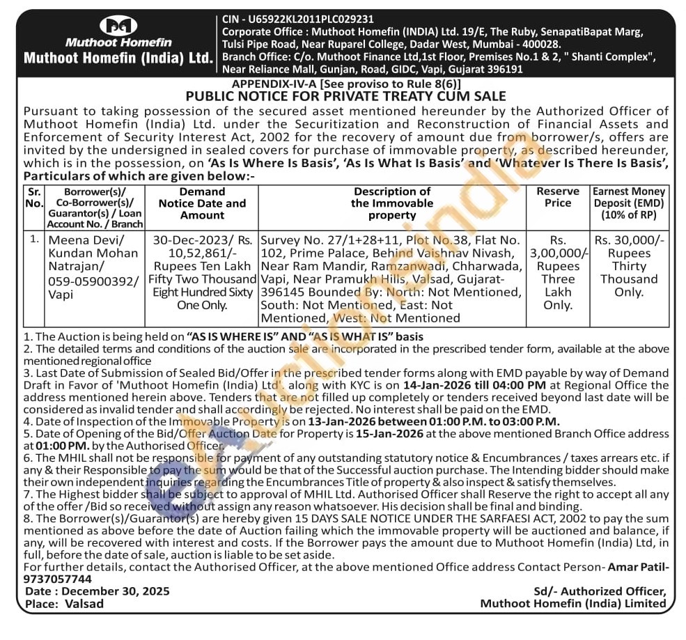Survey No. 27/1+28+11, Plot No.38, Flat No. 102, Prime Palace, Behind Vaishnav Nivash, Near Ram Mandir, Ramzanwadi, Chharwada, Vapi, Near Pramukh Hills, Valsad, Gujarat-396145 Bounded By: North: Not Mentioned, South: Not Mentioned, East: Not Mentioned, West: Not Mentioned
