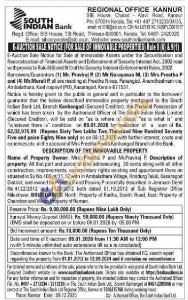 All that part and parcel of land admeasuring 30 cents along with all other construction, improvements, easementary rights existing and appurtenant there on situated in Sy No. 100 pt/11, 12 with in Ambalathara Village, Hosdurg Taluk, Kasaragod District, and owned by Preetha P and Praviraj P morefully described in Jenmam Deed No.4122/2012 and 4123/2012 both dated 01.10.2012 of Sub Registrar Office Nileshwar, BOUNDARIES: North: Property of Radha, South: Road, East: Property of Chandran and West: Property of Raman.