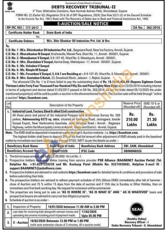 Industrial Land, Factory Shed & allied Civil construction : All those piece and parcel of the Industrial Purpose land at Revenue Survey No. 569 paikee, Admeasuring 6273 sq. mtrs, situated on Devrajiya Road, Jesingpara, beside Sonpal Export, Near Harikrushna Gaushala, Juna Devaliya Road/Amreli Bagasara Highway, within the Municipality Limits at Amreli, Taluka and District-Amreli, Gujarat