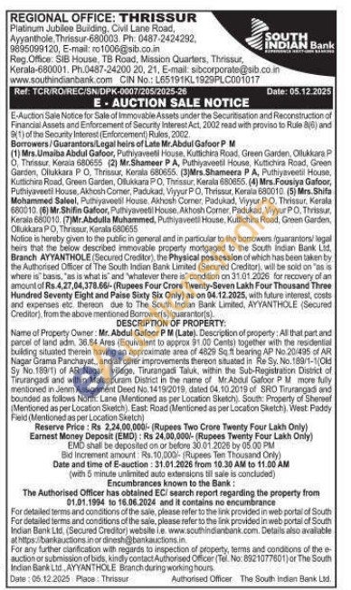 All that part and percel of land adm, 36.84 Ares (Equivalent to approx 91.00 Cents) together with the residential building situated therein having an approximate area of 4829 Sqft bearing AP No. 20/495 of AR Nagar Grama Panchayat, and all other improvements thereon situated in Re Sy. No.189/1-1(Old Sy No. 189/1) of AR Nagar vilage, Tirurangadi Taluk, within the Sub-Registration District of Tinarangadi and within Malappuram District in the name of Mr. Abdul Gafoor PM more fuly mentioned in Jenm Assignment Deed No. 1419/2019, dated 04.10.2019 of SRO Tirurangadi and bounded as follows North: Lane (Mentioned as per Location Sketch). South: Property of Shereef (Mentioned as per Location Sketch). East: Road (Mentioned as per Location Sketch). West Paddy Field (Mentioned as per Location Sketch)