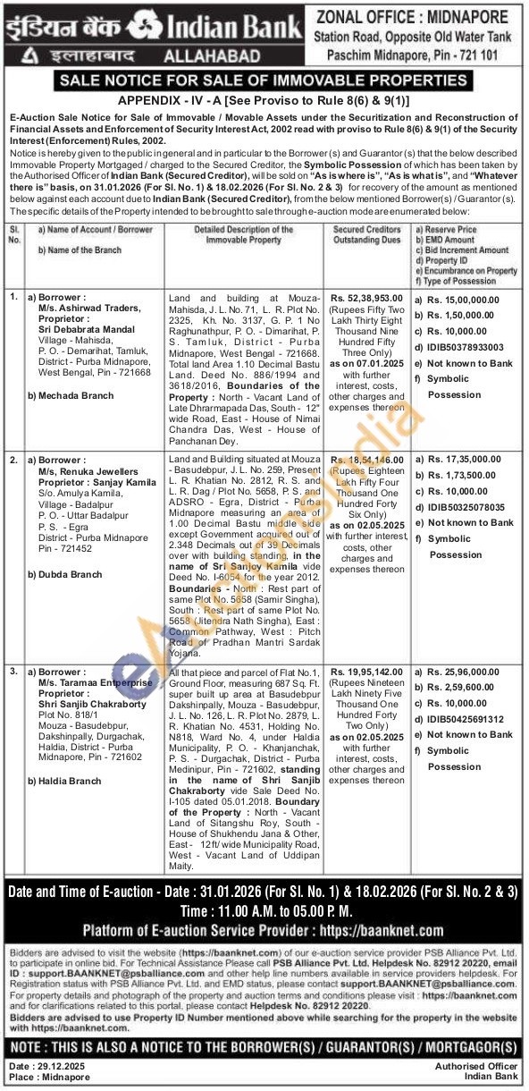 Land and building at Mouza-Mahisda, J. L. No. 71. L. R. Plot No. 2325, Kh. No. 3137, G. P. 1 No Raghunathpur, P. O. Dimarihat, P. S. Tamluk, District Purbal Midnapore, West Bengal 721668. Total land Area 1.10 Decimal Bastu Land. Deed No. 886/1994 and 3618/2016, Boundaries of the Property: North Vacant Land of Late Dhrarmapada Das, South-12" wide Road, East House of Nimai Chandra Das, West House of Panchanan Dey