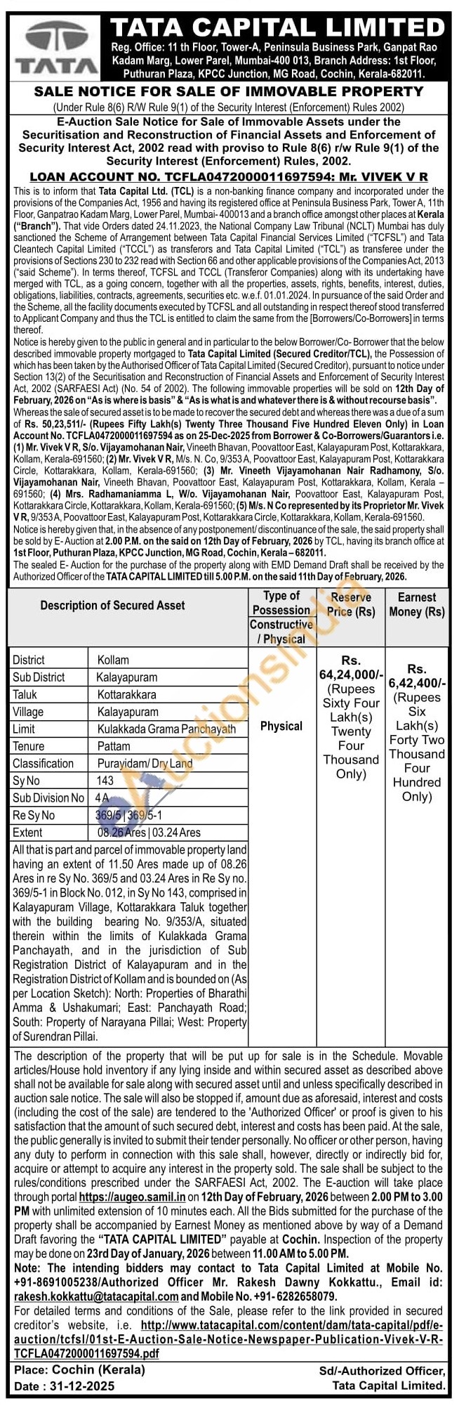 All that is part and parcel of immovable property land having an extent of 11.50 Ares made up of 08.26 Ares in re Sy No. 369/5 and 03.24 Ares in Re Sy no. 369/5-1 in Block No. 012, in Sy No 143, comprised in Kalayapuram Village, Kottarakkara Taluk together with the building bearing No. 9/353/A, situated therein within the limits of Kulakkada Grama Panchayath, and in the jurisdiction of Sub Registration District of Kalayapuram and in the Registration District of Kollam and is bounded on (As per Location Sketch): North: Properties of Bharathi Amma & Ushakumari; East: Panchayath Road; South: Property of Narayana Pillai; West: Property of Surendran Pillai.