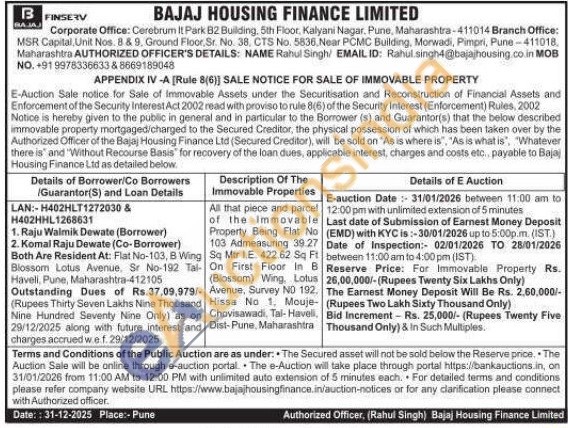 All that piece and parcel of the immovable Property Being Flat No 103 Admeasuring 39.27 Sq Ft Mtr I.E. 422 62 Sq On First Floor In B (Blossom) Wing, Lotus Avenue, Survey No 192. Hissa No 1. Mouje Chovisawadi, Tal- Havell, Dist-Pune, Maharashtra