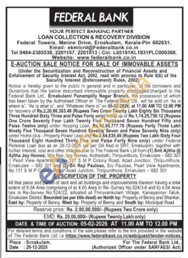 DESCRIPTION OF THE PROPERTY : All that place and parcel of land and all buildings and improvements thereon having a total extent of 8.04 Ares comprising of a) 4.00 Ares in Re- Survey No.524/3-6 and b) 4.04 Ares Les in Re-Survey No.524/22, situated at Thiruvankulam Village, Kanayannur Taluk, Emakulam District Bounded (as per title deed) on North by: Property of Benny and Shankar, East by: Property of Benny. West by: Property of Benny and South by: Municipal Road