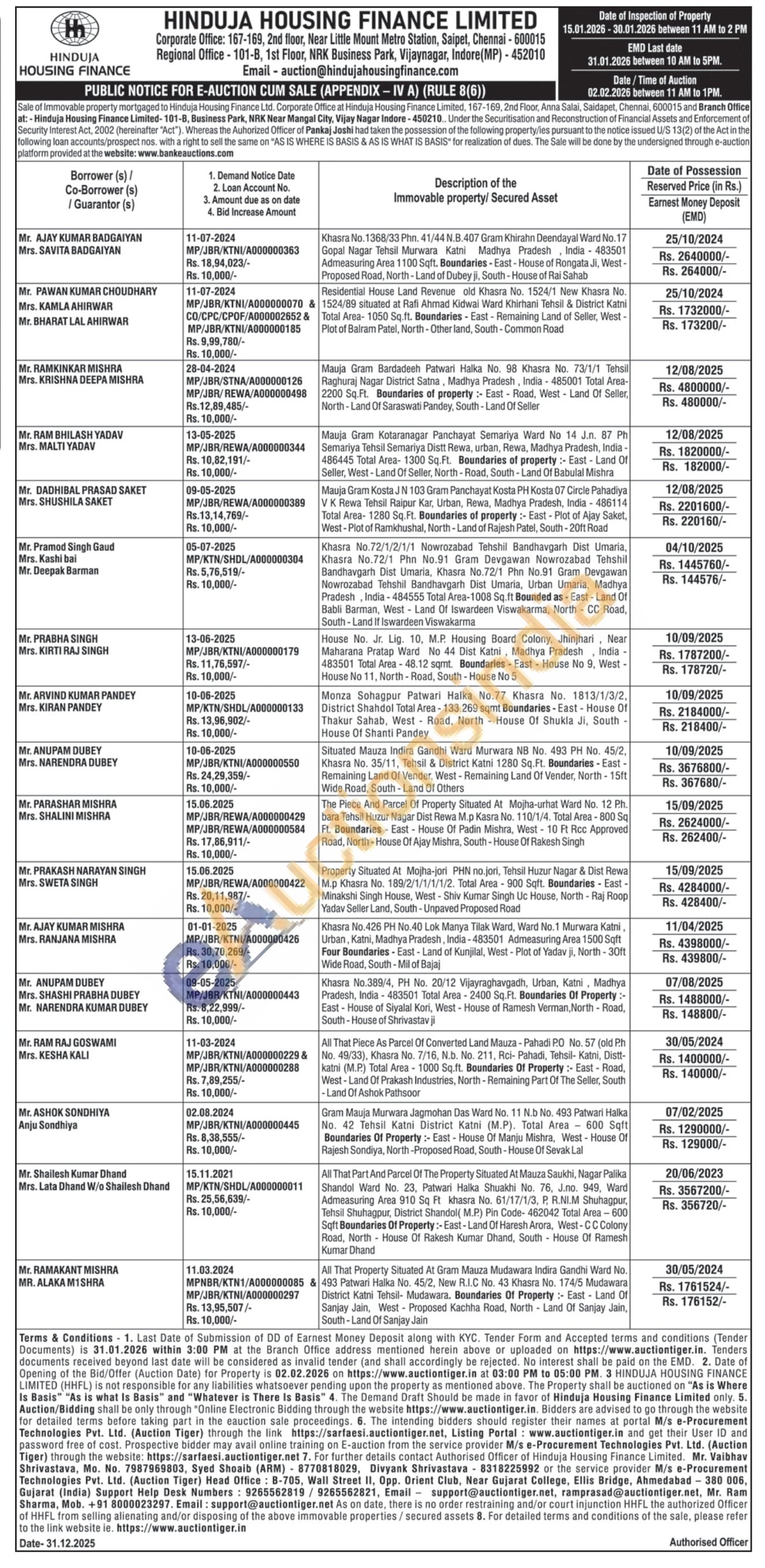 contact Authorised Officer of Hinduja Housing Finance Limited. Mr. Vaibhav hrivastava, Mo. No. 7987969803, Syed Shoaib (ARM) 8770818029, Divyank Shrivastava 8318225992