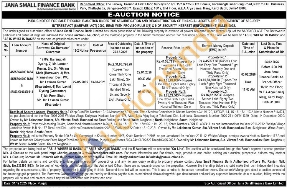 Details of Secured Assets: Property No.3: Industrial Property Rakba 990 Sq Gaj Comprised in Khasra Number 45//5, Khata Number 194/198, as per Jamabandi for the Year 2011-12, Wakiya Village Jamalpur Awana Hadbast Number 177 Abadi known as Mahavir Colony, Near Preet Nagar Tehsil and Dist Ludhiana, Punjab. Documents 2023-24/106/1/2322 Dated 03-05-2023. Owned by Mr. Lakshman Kumar, S/o. Vikram Shah, Bounded as: East: Neighbour, West: Street, North: Street, South: Neighbour