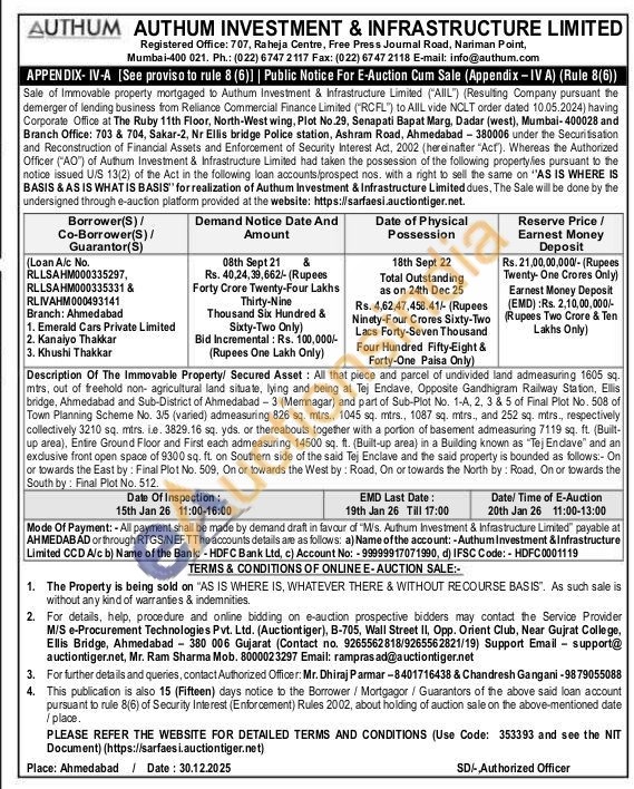 Description Of The Immovable Property/ Secured Asset: All that piece and parcel of undivided land admeasuring 1605 sq. mtrs, out of freehold non- agricultural land situate, lying and being at Tej Enclave, Opposite Gandhigram Railway Station, Ellis bridge, Ahmedabad and Sub-District of Ahmedabad-3 (Memnagar) and part of Sub-Plot No. 1-A, 2, 3 & 5 of Final Plot No. 508 of Town Planning Scheme No. 3/5 (varied) admeasuring 826 sq. mtrs., 1045 sq. mtrs., 1087 sq. mtrs., and 252 sq. mtrs., respectively collectively 3210 sq. mtrs. i.e. 3829.16 sq. yds. or thereabouts together with a portion of basement admeasuring 7119 sq. ft. (Built-up area), Entire Ground Floor and First each admeasuring 14500 sq. ft. (Built-up area) in a Building known as "Tej Endave" and an exclusive front open space of 9300 sq. ft. on Southern side of the said Tej Enclave and the said property is bounded as follows:- On or towards the East by: Final Plot No. 509, On or towards the West by: Road, On or towards the North by: Road, On or towards the South by: Final Plot No. 512.