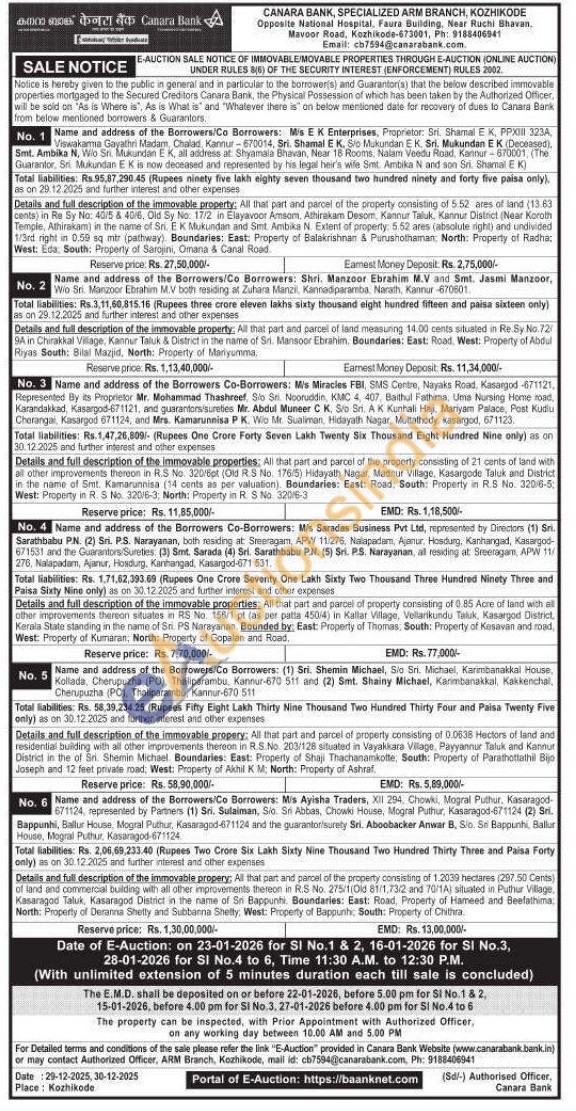 Details and full description of the immovable properties: All that part and parcel of property consisting of 0.85 Acre of land with all other improvements thereon situates in RS No. 156/1 pt (as per patta 450/4) In Kallar Village, Vellarikundu Taluk, Kasargod District. Kerala State standing in the name of Sri. PS Narayanan. Bounded by: East: Property of Thomas: South: Property of Kesavan and road, West: Property of Kumaran, North: Property of Gopalan and Road