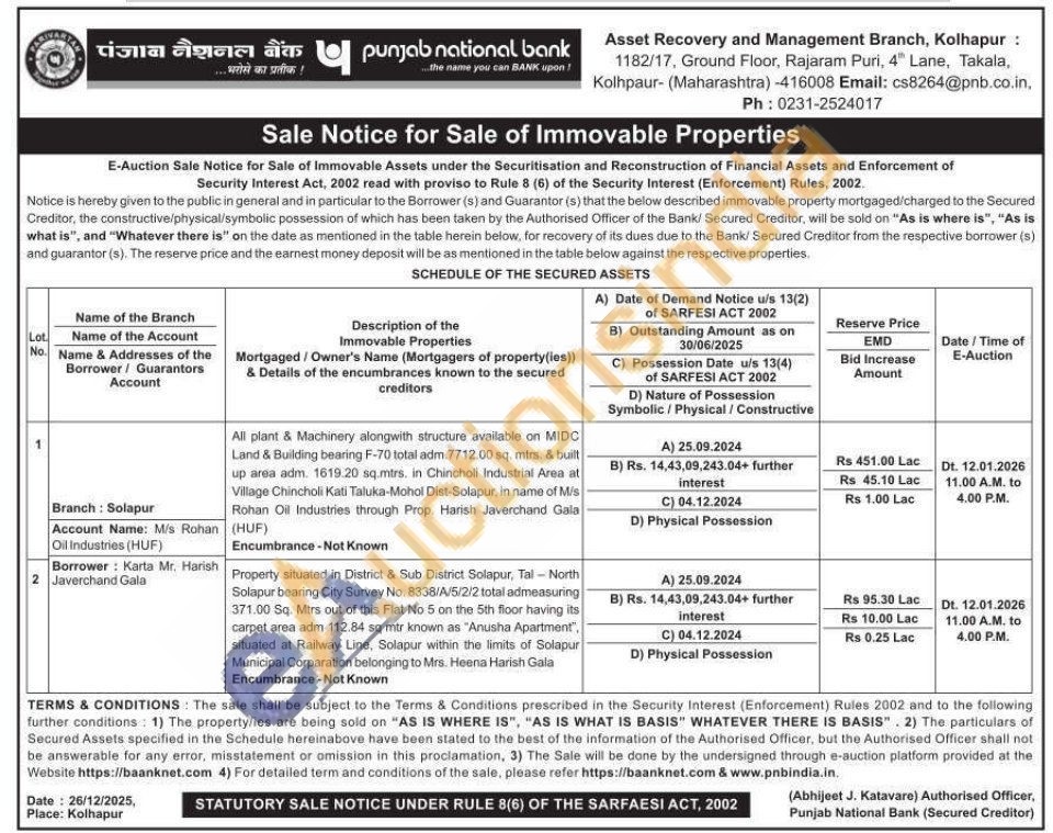 Property situated in District & Sub District Solapur, Tal - North Solapur bearing City Survey No. 8338/A/5/2/2 total admeasuring 371.00 Sq. Mtrs out of this Flat No 5 on the 5th floor having its carpet area adm 112.84 sq mtr known as "Anusha Apartment", situated at Railway Line, Solapur within the limits of Solapur Municipal Corparation belonging to Mrs. Heena Harish Gala Encumbrance-Not Known