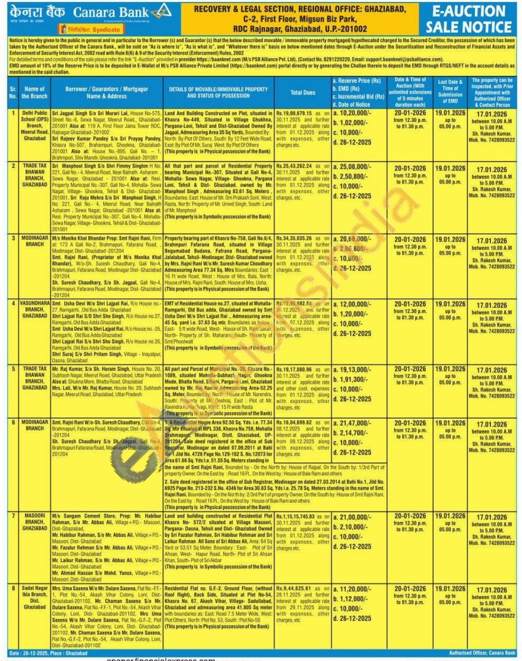 7) Land and building constructed at Residential Plot Khasra No- 572/2 situated at Village Masoori, Pargana- Dasna, Tehsil and Dist- Ghaziabad Owned by Sri Fazalur Rahman, Sri Habibur Rehman and Sri Laikur Rahman All Sons of Sri Abbas Ali, Area: 64 Sq Yard or 53.51 Sq Meter, Boundary: East- Plot of Sri Ahsan, West- Hapur Road, North- Plot of Sri Ahsan Khan, South-Plot of Sri Akbar (This property is in Symbolic possession of the Bank)
