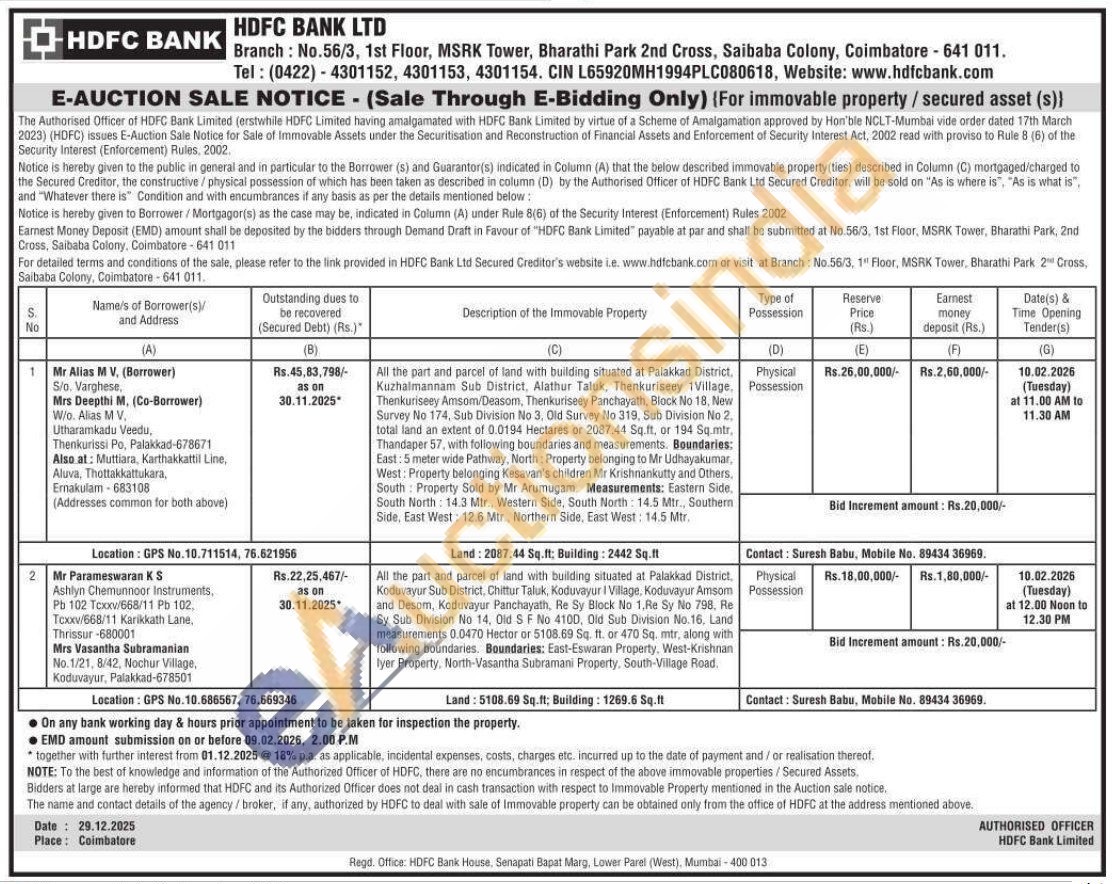 All the part and parcel of land with building situated at Palakkad District, Kuzhalmannam Sub District, Alathur Taluk, Thenkuriseey 1Village, Thenkuriseey Amsom/Deasom, Thenkuriseey Panchayath, Block No 18, New Survey No 174, Sub Division No 3. Old Survey No 319, Sub Division No 2. total land an extent of 0.0194 Hectares or 2087.44 Sq.ft, or 194 Sq.mtr, Thandaper 57, with following boundaries and measurements. Boundaries: East: 5 meter wide Pathway, North: Property belonging to Mr Udhayakumar, West: Property belonging Kesavan's children Mr Krishnankutty and Others. South Property Sold by Mr Arumugam. Measurements: Eastern Side, South North: 14.3 Mtr., Western Side, South North: 14.5 Mtr., Southern Side, East West: 12.6 Mtr Northern Side, East West: 14.5 Mtr.