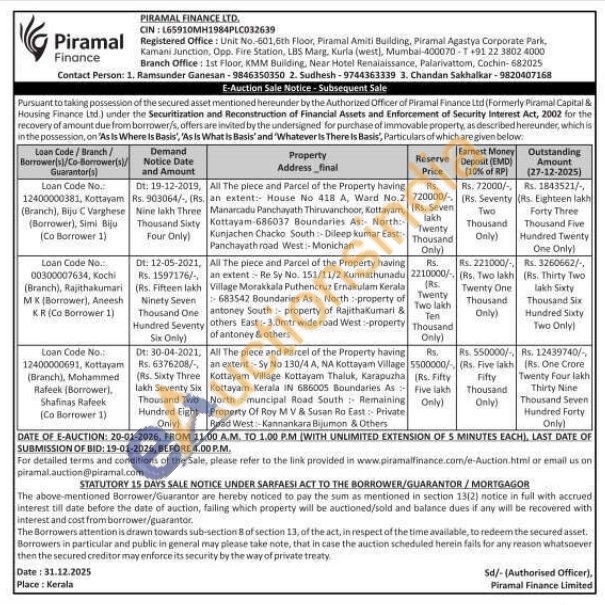 1) All The plece and Parcel of the Property having an extent: House No 418 A, Ward No.2 Manancadu Panchayath Thiruvanchoor, Kottayam, Kottayam-686037 Boundaries As: North Kunjachen Chacko South Dileep kumar East: Panchayath road West:-Monichan