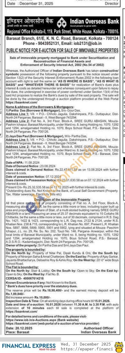 All that piece and parcel of property consisting of Flat no. A. 3rd Floor, Block A, measuring about 1130 sqft, be the same a little more or less, including super built up area and proportionate share of Stair, of a multi storied building namely SREE GURU ABASAN in a land measuring an area of 25.37 decimals equivalent to 15 Cottahs 06 Chittacks, be the same a little more or less, out of 30 decimals, comprised in R.S. Dag No. 1421, 1422 8 1422 & 1423. 423, corresponding to LR. Dag nos. 2122 & 2124, 122 & 2124, under R.S. Khatian Nos. 238 & 715, comesponding to LR. Khatian No. 697, Present LR. Khatian Nos. 5897, 5898, 5899, 5900, 5901 and 5902, lying and situated at Mouza-Paschim Ichapur, JL, no. 29, Re. Su. No. 202. Touzi No. 146, Pargana-Anwarpur, within the local limits of Barasat Municipality, under Ward no. 8, being Holding no. 1070, 1292 and 1294, amalgamated Holding no. 1070, Boys School Road, P.S.- Barasat,