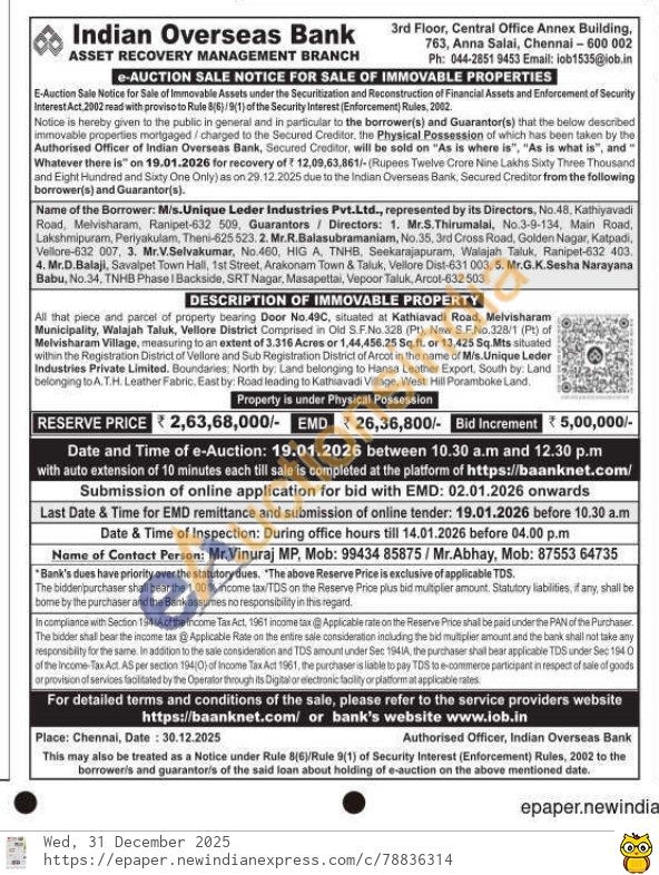 All that piece and parcel of property bearing Door No.49C, situated at Kathiavadi Road, Melvisharam Municipality, Walajah Taluk, Vellore District Comprised in Old S.F.No.32B (Pt), New S.F.No.328/1 (Pt) of Melvisharam Village, measuring to an extent of 3.316 Acres or 1,44,456.25 Sq.ft. or 13,425 Sq.Mts situated within the Registration District of Vellore and Sub Registration District of Arcot in the name of M/s. Unique Leder Industries Private Limited, Boundaries: North by: Land belonging to Hansa Leather Export, South by: Land belonging to A.T.H. Leather Fabric, East by: Road leading to Kathiavadi Village, West: Hill Poramboke Land
