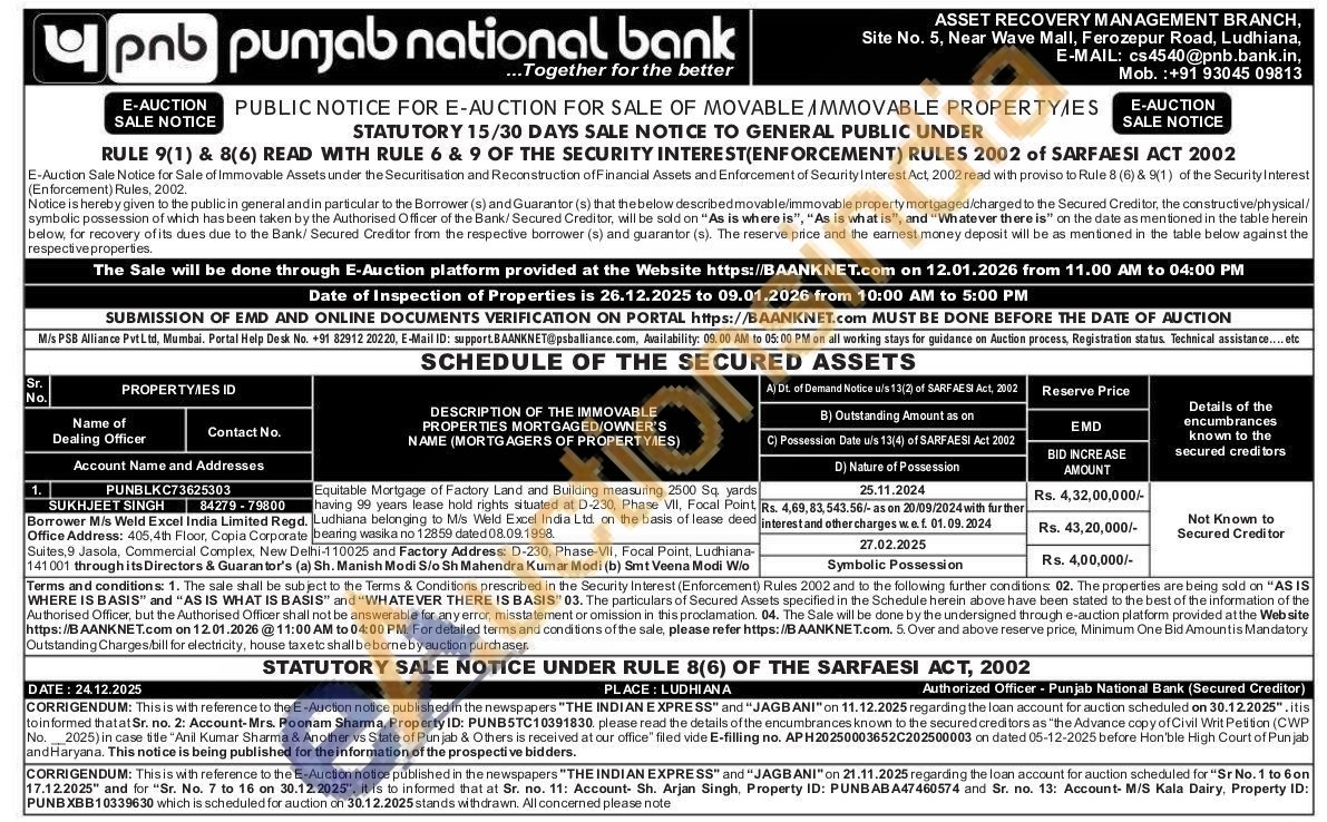 Equitable Mortgage of Factory Land and Building measuring 2500 Sq yards having 99 years lease hold rights situated at D-230, Phase VII, Focal Point . Ludhiana