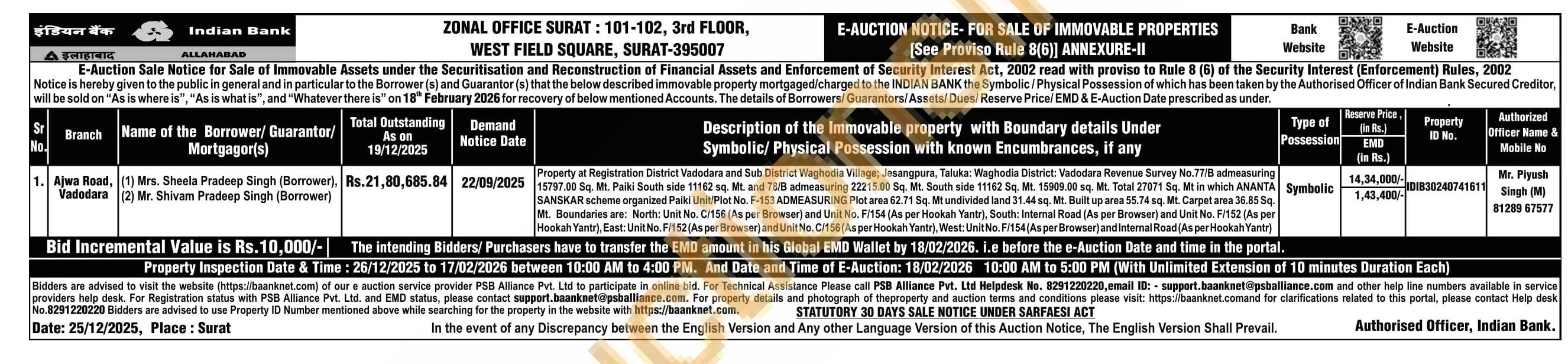Property at Registration District Vadodara and Sub District Waghodia Village; Jesangpura, Taluka: Waghodia District: Vadodara Revenue Survey No.77/B admeasuring 15797.00 Sq. Mt. Paiki South side 11162 sq. Mt. and 78/B admeasuring 22215.00 Sq. Mt. South side 11162 Sq. Mt. 15909.00 sq. Mt. Total 27071 Sq. Mt in which ANANTA S SANSKAR scheme organized Paiki Unit/Plot No. F-153 ADMEASURING Plot area 62.71 Sq. Mt undivided land 31.44 sq. Mt. Built up area 55.74 sq. Mt. Carpet area 36.85 Sq. Mt. Boundaries are: North: Unit No. C/156 (As per Browser) and Unit No. F/154 (As per Hookah Yantr), South: Internal Road (As per Browser) and Unit No. F/152
