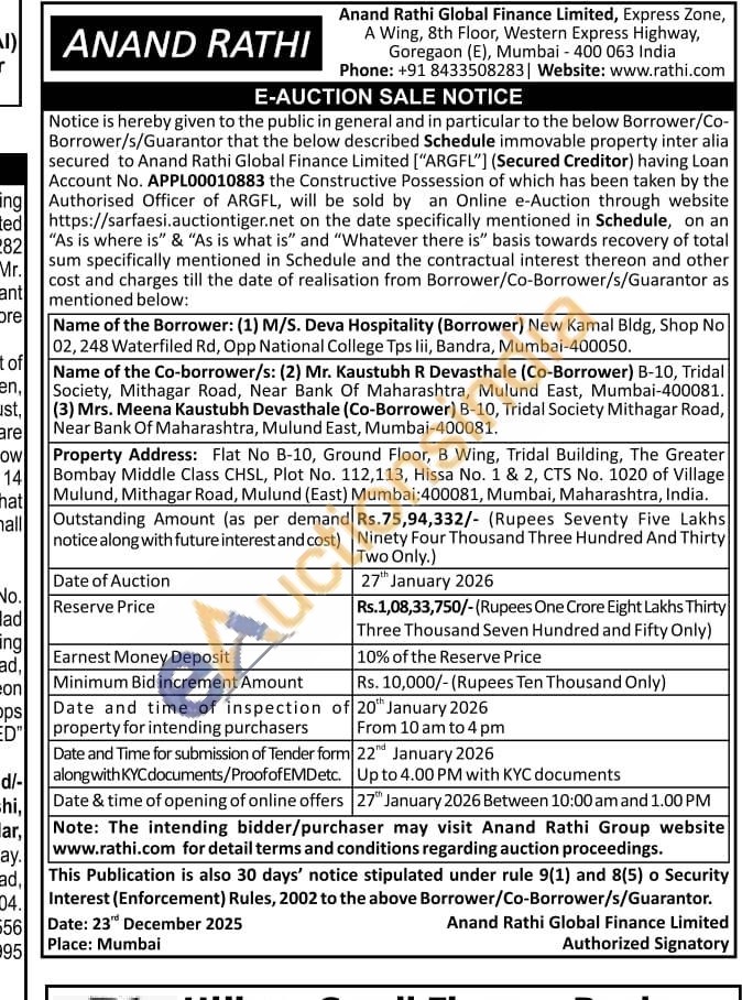Flat No B-10, Ground Floor, B Wing, Tridal Building, The Greater Bombay Middle Class CHSL, Plot No. 112,113, Hissa No. 1 & 2, CTS No. 1020 of Village Mulund, Mithagar Road, Mulund (East) Mumbai: 400081, Mumbai, Maharashtra, India
