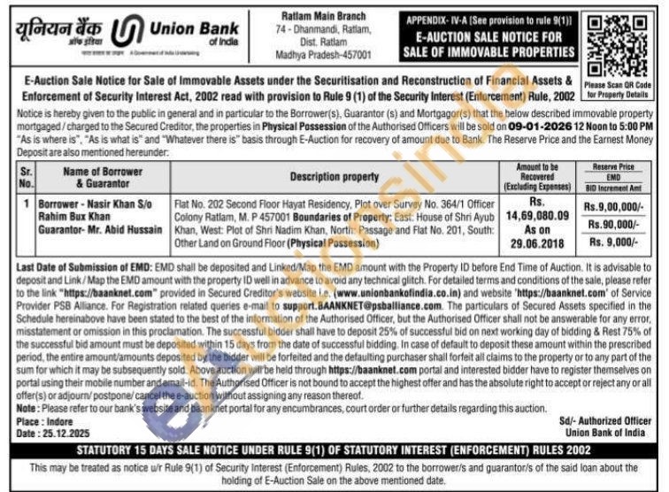 Flat No. 202 Second Floor Hayat Residency, Plot over Survey No. 364/1 Officer Colony Ratlam, M. P457001 Boundaries of Property: East: House of Shri Ayub Khan, West: Plot of Shri Nadim Khan, North: Passage and Flat No. 201, South: Other Land on Ground Floor (Physical Possession)