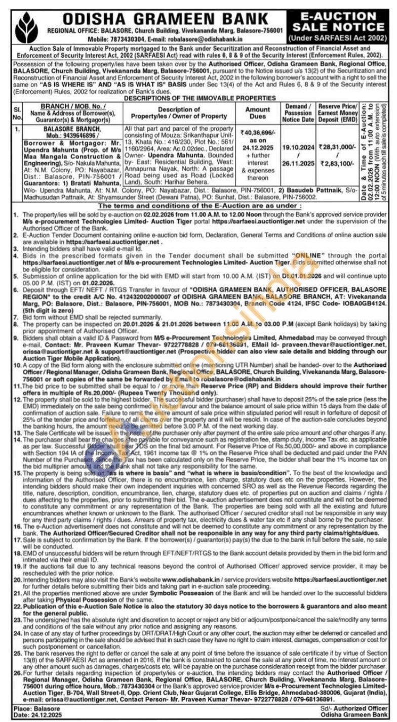 All that part and parcel of the property consisting of Mouza: Srikanthapur Unit 13, Khata No.: 416/230, Plot No.: 561/1160/2964, Area: Ac. 0.02dec, Declared Owner Upendra Mahunta, Bounded by- Eant: East: Residential Building, West: Annapurna Nayak, North: A passage Road being used as Road (Locked Land), South: Harihar Behera.