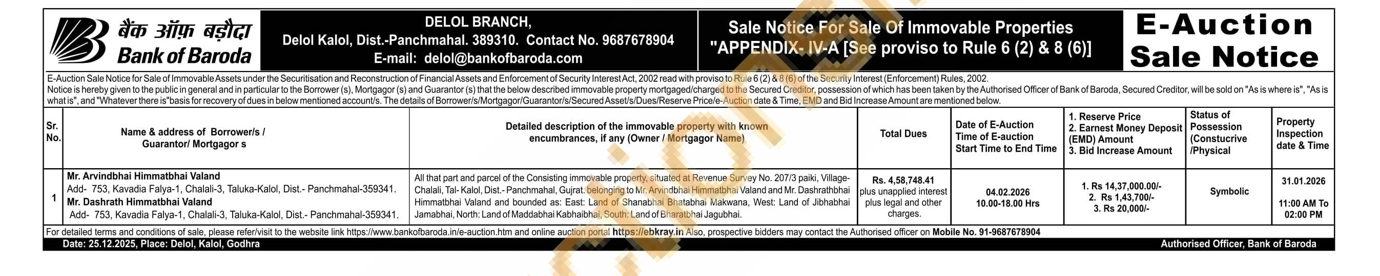 All that part and parcel of the Consisting immovable property, situated at Revenue Survey No. 207/3 paiki, Village-Chalali, Tal-Kalol, Dist.- Panchmahal, Gujrat, belonging to Mr. Arvindbhai Himmatbhai Valand and Mr. Dashrathbhai Himmatbhai Valand and bounded as: East: Land of Shanabhai Bhatabhai Makwana, West: Land of Jibhabhai Jamabhai, North: Land of Maddabhai Kabhaibhai, South: Land of Bharatbhai Jagubhai.