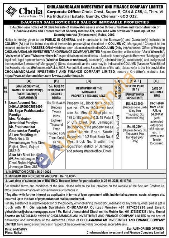 Property i.e., Block No. 4 on sub plot no. 178 to 182/4 over land adm Sq. Mtrs. 62-28 of plot no. 178 to 182 paiki of R.S. 19 Paiki 1 of City Dhrol, Dist. Jamnagar. Boundaries of the property are as under: North: Road. South: Survey No. 19/2 East: Block No. 5 West Block No. 3 within the registration district of Jamnagar and sub registration office, Dhrol