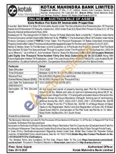 All that piece and parcel of property bearing open Plot No. 13 Admeasuring About 63.56 Sq. Meters plot area on spot and admeasuring about 68.57 sq. meters as per Village Form No. 7/12 along with undivided share inthelandin the Scheme Known As Kavya Residency Vibhag-B, forming part of land bearing revenue Survey No. 232/1, 232/2, 233/1,233/2, 234/ 1,234/2Block No. 30218 As Per Village From No 7*12 Block No. 30218/ 13 of Mouje Mulad of Olpad Taluka in the Registration District and Sub Registration of Surat, DIC B Mulad Olpad Surat-394210., Demarcation of The Plot: East: Adj Plot No. Al 14, West-Road, North Ad BlockNo. 301, South Road