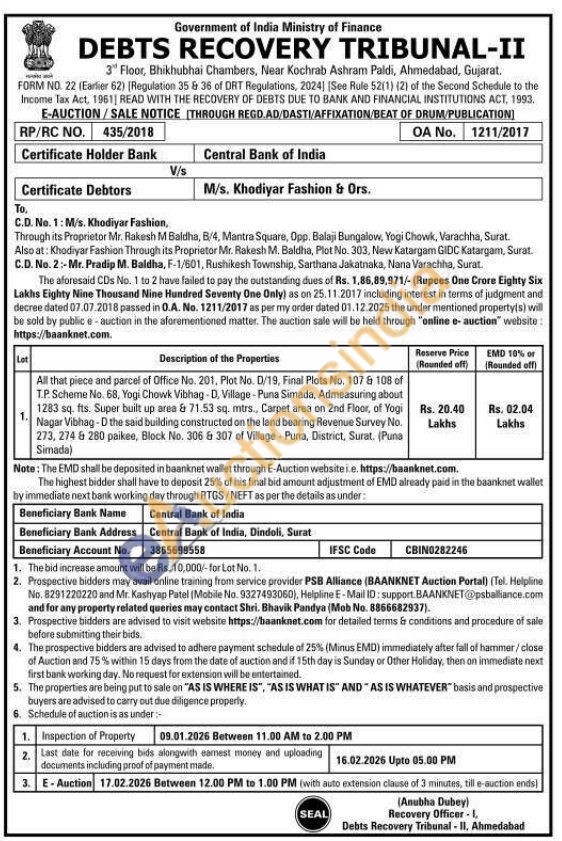 All that piece and parcel of Office No. 201, Plot No. D/19, Final Plots No. 107 & 108 of T.P. Scheme No. 68, Yogi Chowk Vibhag-D, Village-Puna Simada, Admeasuring about 1283 sq. fts. Super built up area & 71,53 sq. mtrs, Carpet area on 2nd Floor, of Yogi Nagar Vibhag-D the said building constructed on the land bearing Revenue Survey No. 273, 274 & 280 paikee, Block No. 306 & 307 of Village-Puna, District, Surat. (Puna Simada)