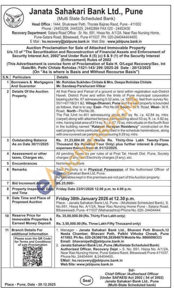 All that Piece and Parcel of a ground or land within registration sub-District Haveli, District Pune and within the limits of Pune municipal corporation bearing plot No. 67 admeasuring 5.52 ares, i.e. 5525 sq. feet from survey No. 55/1+67/18/2/1 &2, Village-Dhanori, Pune and the said property is bounded as follows, that is to say: East-Plot No.66 South-30 ft. Road, West-30 ft. Road, North-Plot No.56