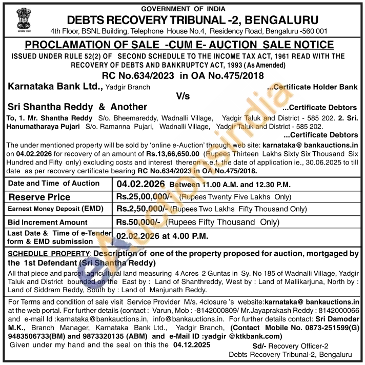 All that piece and parcel agricultural land measuring 4 Acres 2 Guntas in Sy. No 185 of Wadnalli Village, Yadgir Taluk and District bounded on the East by Land of Shanthreddy, West by: Land of Mallikarjuna, North by : Land of Siddram Reddy, South by: Land of Manjunath Reddy