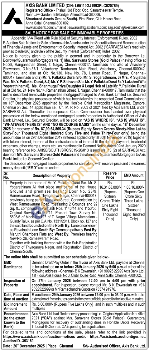 Property in the name of Mr. Y. Pallakku Durai Sío. Mr. S. Yogarathinam All that piece and parcel of land and the building thereon bearing Old Door No. 6, then Door No. 25, New Door No. 30, Natesa lyer Street, T. Nagar, Chennai -600017 being Plot No. 60, covered under the layout of the Mambalam Co-operative Society comprised in Paimash Nos. 68, now T.S. No. 5597 of Block No. 127 of T. Nagar Division, Mambalam Guindy Taluk, measuring East to West 50 feet and North to South 72 feet, an extent of 3600 sq.ft., (1 ground and 1200 Sq. ft.,) and bounded on the North By: Conservancy Lane South By: Natesa lyer Street East By: Door No. 26, New Door No. 28, Natesa lyer Street and West By: Old Door No.24, New Door No. 32, Natesa lyer Street. Situated within the Registration District of South Chennai and Registration Sub District of T. Nagar.