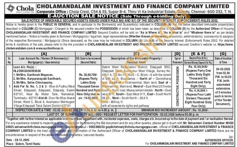 Salem West Registration District, Edappadi SRO, Edappadi Taluk, Avaniperur West Village, Survey No. 435/1 A, T.S.No-1/1, Ward-C, Block-6 with the extent of 869 sq. ft. Boundaries North of Govindharaj land, South of Krishnammal, Mani land, East of Krishnammal, Maniland, West of East-West 20 ft wide South-North road, Measurement details: North-East west 30 ft, South-East West 31 ft., East-South North 28.6 ft., West-South North-28.6 ft.Total-869 sq. ft.