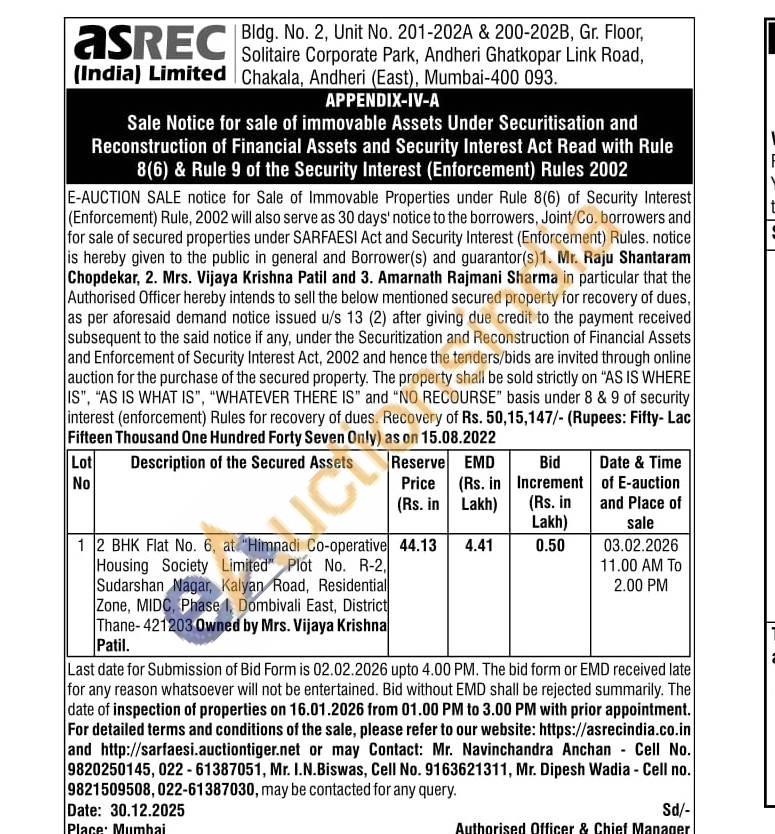2 BHK Flat No. 6, at "Himnadi Co-operative Housing Society Limited" Plot No. R-2, Sudarshan Nagar, Kalyan Road, Residential Zone, MIDC, Phase I, Dombivali East, District Thane-421203 Owned by Mrs. Vijaya Krishna Patil.