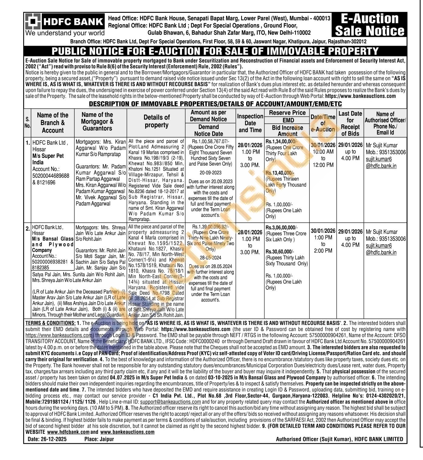 All the piece and parcel of Plot/Land Admeasuring 2 Kanal 19 Marlas comprised in Khasra No.198//19/3 (2-19), Khewat No.983//850 Min, Khatoni No.1251 Situated at Village Mirzapur, Tehsil & Distt-Hissar, Haryana. Registered Vide Sale deed No.8236 dated 18-12-2017 at Sub Registrar. Hissar, Haryana. Standing in the name of Smt. Kiran Aggarwal W/o Padam Kumar S/o Rampratap