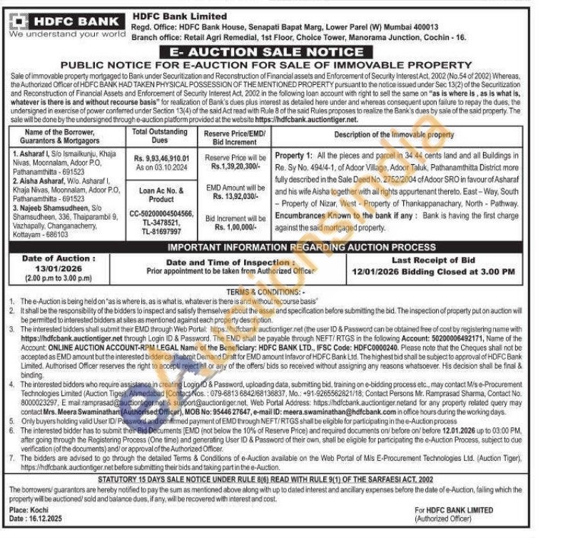 Property 1: All the pieces and parcel in 34.44 cents land and all Buildings in Re. Sy No. 494/4-1, of Adoor Village, Adoor Taluk, Pathanamthitta District more fully described in the Sale Deed No. 2752/2004 of Adoor SRO in favour of Asharaf and his wife Aisha together with all rights appurtenant thereto. East-Way, South Property of Nizar, West-Property of Thankappanachary, North - Pathway. Encumbrances Known to the bank if any: Bank is having the first charge against the said mortgaged property.
