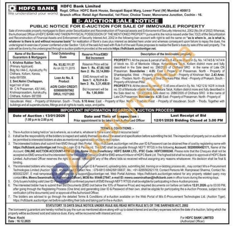 PROPERTY I: All the pieces & parcel of land in 6.48 ares of land in Sy. No. 147/4/5 & 147/4/4 of block no. 53 of Mankode Village, Kottarakkara Taluk, Kollam district more and fully described in the Sale deed no. 296/2006 of Chithara SRO in the name of Late CN Prasannan. Boundaries: 4.05: East Property of Prasannan. North Property of Shankarapillai, West Property of Srimathi. South Property of Krishnan Nair. 2.43 Ares: East -Thadam. North-Property of Siva Shankara Pillai. West-Property of Prakash, South-Property of Krishnan Pillai