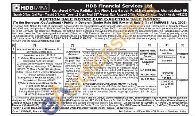 All the piece and parcel of the land having a total extent of 4.27 ares comprised of 2.85 Ares lies in Re Sy No. 61(Old Sy No. 10/9) in Block No.62 and 1.42 Ares lies in Fte Sy No.24 (Old Sy.No. 10/8) in Block No.62 of Kottayam Village together with Building bearing No. Xil/425, Xil/426, XIII/427A of Kottayam am Muncipality situated in Kottayam Taluk lying in Sub-Registraion district of Kottayam and the registration district of Kottyam and is bounded by North: Property of Jaymon John, South Property of K.J. Philip Kandarapallil, East Road, West: Property of Dr. Suresh