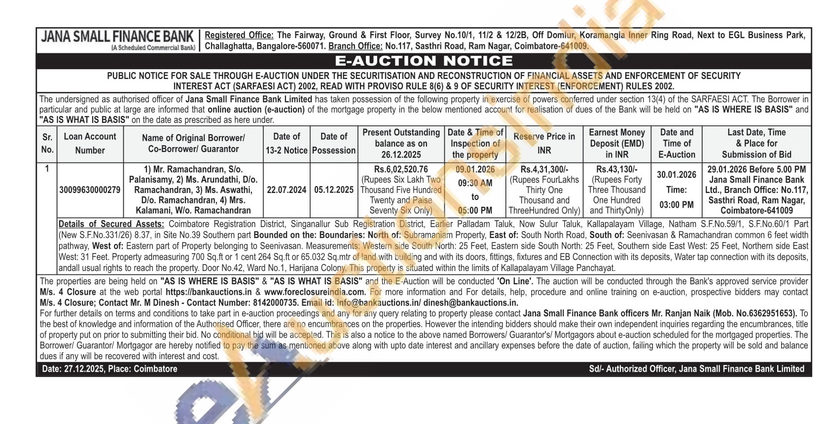 Details of Secured Assets: Coimbatore Registration District, Singanallur Sub Registration District, Earlier Palladam Taluk, Now Sulur Taluk, Kallapalayam Village, Natham S.F.No.59/1, S.F.No.60/1 Part (New S.F.No.331/26) 8.37, in Site No.39 Southern part Bounded on the: Boundaries: North of: Subramaniam Property, East of: South North Road, South of: Seenivasan & Ramachandran common 6 feet width pathway, West of: Eastern part of Property belonging to Seenivasan. Measurements: Western side South North: 25 Feet, Eastern side South North: 25 Feet, Southem side East West: 25 Feet, Northern side East West: 31 Feet. Property admeasuring 700 Sq.ft or 1 cent 264 Sq.ft or 65.032 Sq.mtr of land with building and with its doors, fittings, fixtures and EB Connection with its deposits, Water tap connection with its deposits, andall usual rights to reach the property. Door No.42, Ward No.1, Harijana Colony. This property is situated within the limits of Kallapalayam Village Panchayat