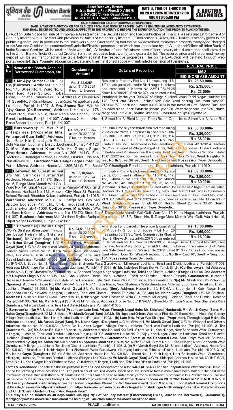 Industrial Property constructed on plot measuring 286 Square Yards, Comprised in Khasra No. 304, 305, 306, 307, 308, 309,310, 311, 312, 313, 314, 315, 316, 317, 318, 319, Khewat No. 245, Khatauni No. 276, As entered in the Jamabandi for the Year 2013-2014, Hadbast No. 235. Situated at Village Mangali Unchi, Sub Tehsil Sahnewal, District Ludhiana in the Name of Mr. Amanpreet Kaur, vide Sale Deed bearing Wasika No. 6573, dated 11.01.2022 and bounded are as Under: East: Neighbor 75 feet, West: Neighbor 68 feet, North: Street 36 feet, South: Neighbor 37 feet. Possession Type: Symbolic.