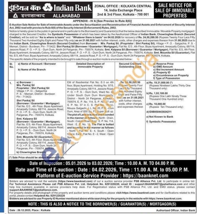 EM of Resdiential Flat No. E-3 on 4th floor, Biyas Apartment, Holding No. 97/5. Amarpally Colony, 68/114, Jessore Road. POPS-Dum Dum, Ward No. 22 Under South Dum Dum Municipality, District - North 24 Parganas, Kolkata 700074, E. P. No. 114, S. P. No. 37 and S. P. No. 37 in C. S. Plot No. 191(p), Mouza-Satgachi, J. L. No. 20, P. S.-Dum Dum, Area of 850 Sq. Ft. Super built up. The plot of Land is butted and bounded in the manner as follows-North: Drain, South: Colony Road, East: E. P. No. 114, West: E. P. No. 15, The Flat is butted and bounded in the manner as follows North Flat No. E-4, South: Open Space, East: Flat No. E-2, West: Open Space.