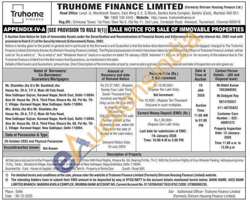 All that piece and parcel of the Property bearing No. 29-A, Third Floor With Roof Rights, Khasra No. 60, Bearing Pvt No. TH-2. With the Common Rights of Four Wheeler Parking, Admeasuring Area 70 Sq., Yards, Situated at Village-Karawal Nagar, In the Abadi of New Sabhapur, Illaqa Shahdara. Delhi-110094. Bounded By:-East-House of Jagdish West:-Vacant Plot. North: Property of Bimla Devi South: Road 30ft