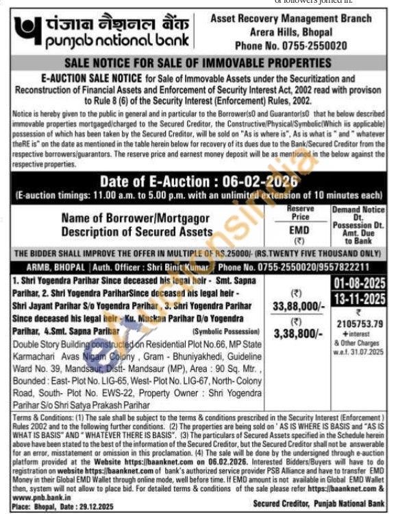 Double Story Building constructed on Residential Plot No.66, MP State Karmachari Avas Nigam Colony, Gram Bhuniyakhedi, Guideline Ward No. 39, Mandsaur, Distt- Mandsaur (MP), Area: 90 Sq. Mtr., Bounded: East-Plot No. LIG-65, West- Plot No. LIG-67, North-Colony Road, South- Plot No. EWS-22, Property Owner: Shri Yogendra Parihar S/o Shri Satya Prakash Parihar