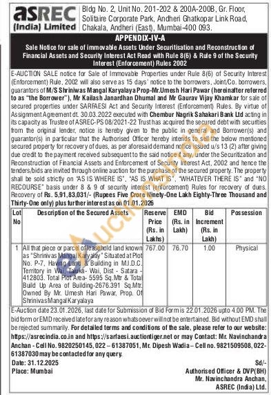 All that piece or parcel of leasehold land known as "Shrinivas Mangal Karyalay Situated at Plot No. P-7, Having Land & Building in M.I.D.C Territory in Wai, Taluka-Wai, Dist- Satara 412803. Total Plot Area-5595 Sq.Mtr & Total Build Up Area of Building-2676.391 Sq.M Owned By Mr. Umesh Hari Pawar, Prop. Of Shrinivas Mangal Karyalaya