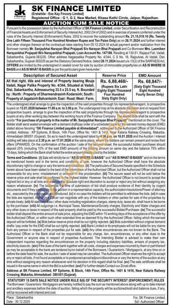 All that right, title and interest of Property bearing Mouje Vadali, Nagar Palika Property No. 4/344, Situated at Vadali, Dist. Sabarkantha, Admeasuring 33.5 x 23.5 sq. ft. Bounded by: North: Property of Dharmendrasinh Kodarsinh; South: Property of Jagatsinh Balvantsinh; East: Road; West: Farm.