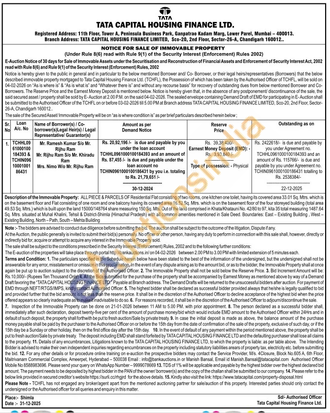 Description of the Immovable Property: ALL PIECE & PARCELS OF Residential Flat consisting of two rooms, one kitchen one toilet, having its covered area 33.01 Sq. Mtrs, which is on the basement floor and Flat consisting of one room and one balcony having its covered area 16.52 Sq. Mtrs. which is on the basement floor of the four storeyed building (total area 49.53 Sq. Mtrs.) which is built upon the land 15000/148764 share measuring 150 Sq. Mts. Out of the land comprised in Khata/Khatauni No. 42/80 to 97, kita 35 total measuring 1487.64 Sq. Mtrs situated at Muhal Khalini, Tehsil & District-Shimla (Himachal Pradesh) with all common amenities mentioned in Sale Deed. Boundaries: East-Existing Building, West-Existing Building, North-Path, South-Mehta Building