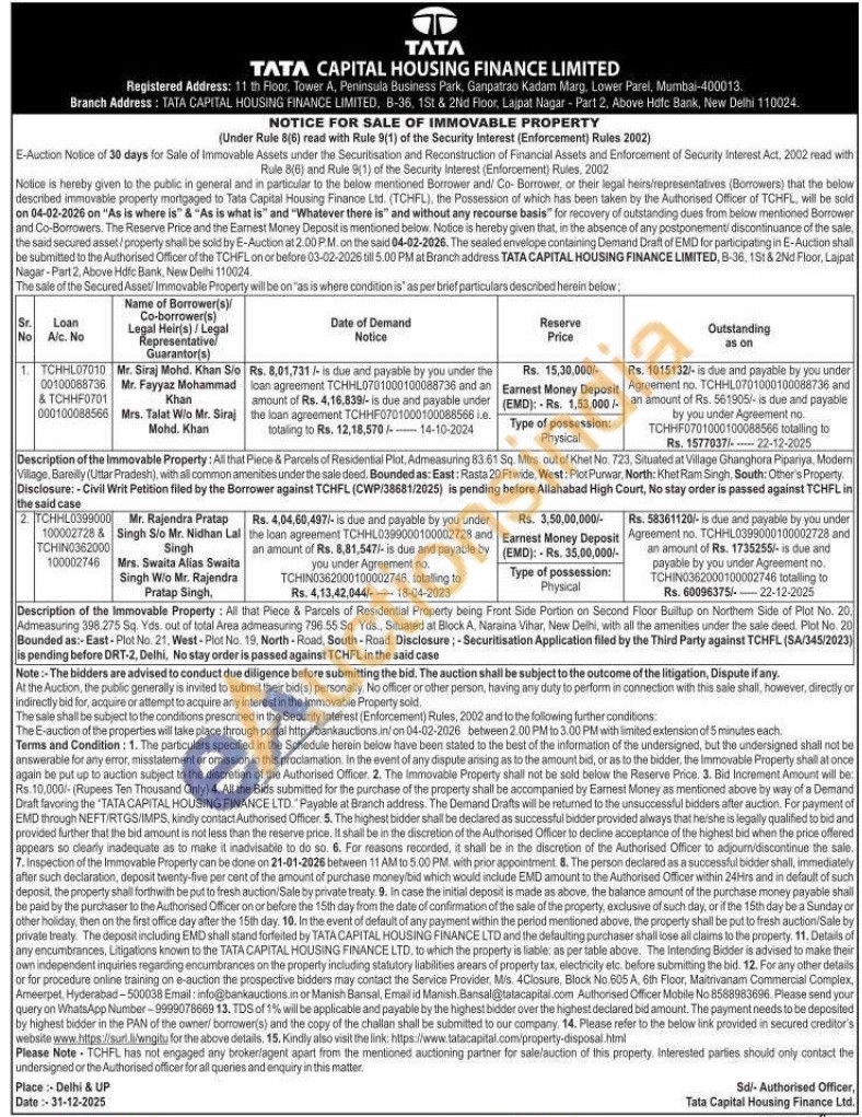 Description of the Immovable Property: All that Piece & Parcels of Residential Property being Front Side Portion on Second Floor Builtup on Northern Side of Plot No. 20. Admeasuring 398.275 Sq. Yds. out of total Area admeasuring 796.55 Sq. Yds, Situated at Block A, Naraina Vihar, New Delhi, with all the amenities under the sale deed. Plot No. 20 Bounded as:-East-Plot No. 21, West-Plot No. 19, North-Road, South-Road. Disclosure; -Securitisation Application filed by the Third Party against TCHFL (SA/345/2023) is pending before DRT-2, Delhi, No stay order is passed against TCHFL in the said case