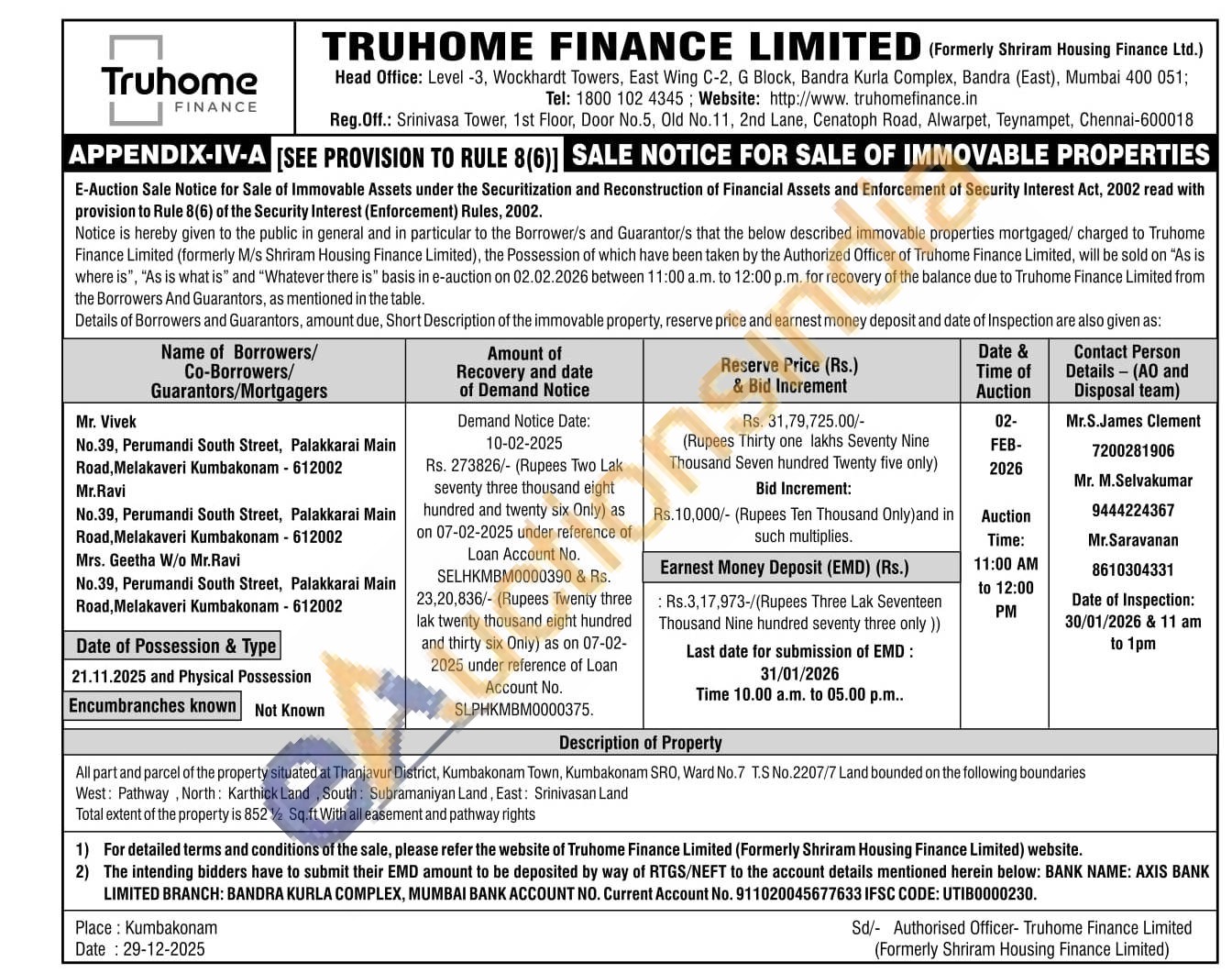 All part and parcel of the property situated at Thanjavur District, Kumbakonam Town, Kumbakonam SRO, Ward No.7 T.S No.2207/7 Land