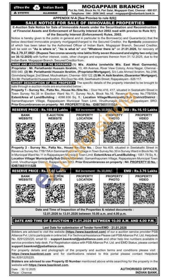 Property 2 Survey No.. Patta No., House No./Site No.: Door No.409, situated in Seetakathi Street in Revenue Survey No. 778/15Ain Sammanthapuram Village in Town Survey No.30 in Survey Ward in Block No. 16 in Municipal Ward No. 11 in Rajapalayam Municipal Town Limit: Extent/Area of Land/Building: 1061.78 Sq. ft. Location Village/ Municipality/Sub District/District: Samanthapuram Village, Rajapalayam Municipal Town Limit, Virudhunagar District, Rajapalayam SRO.